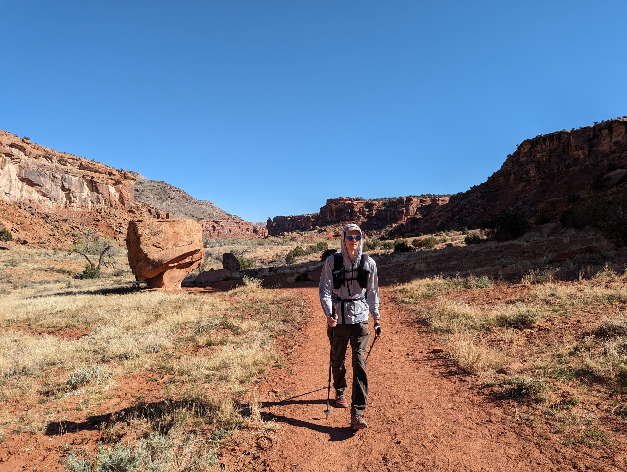 hiker in red sandstone desert wearing grey zpacks mirage hoody
